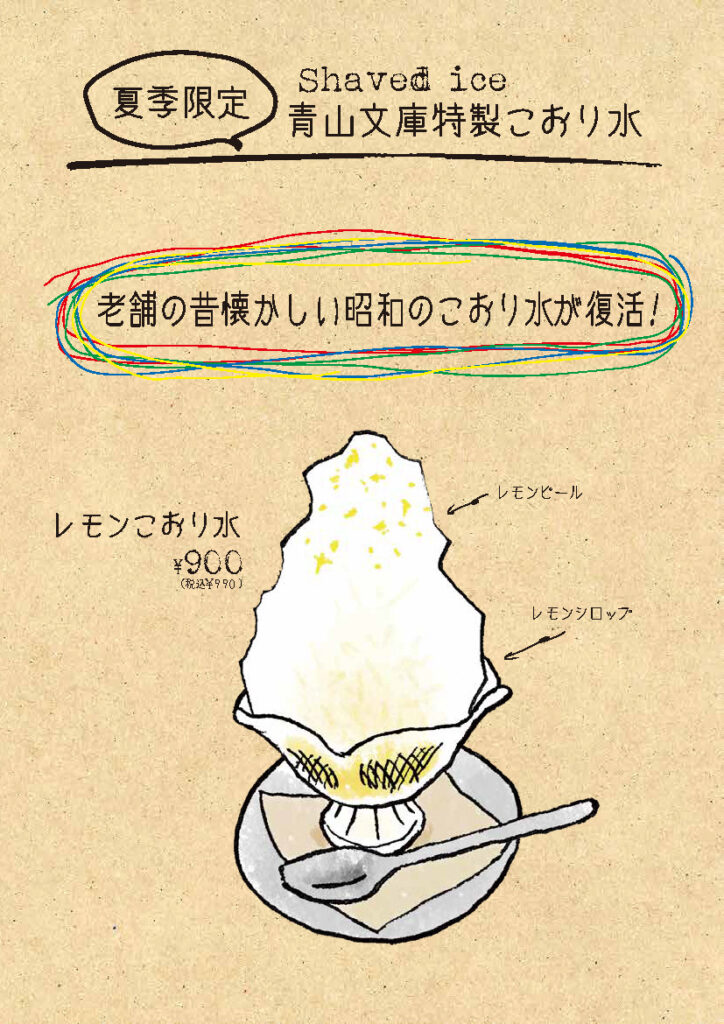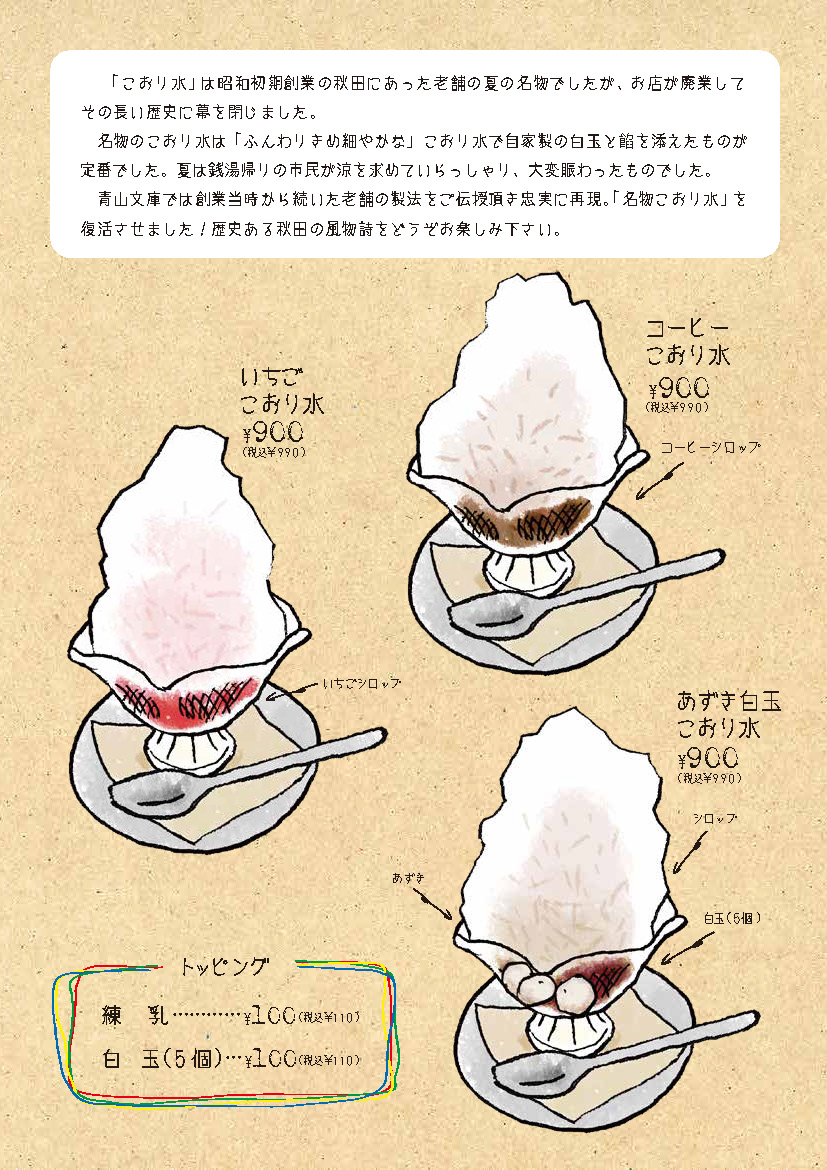 夏期限定 青山文庫特製こおり水 (今季は終了しました 24.08.31) 老舗の昔懐かしい昭和のこおり水が復活! 「こおり水」は昭和初期創業の秋田にあった老舗の夏の名物でしたが、お店が廃業してその長い歴史に幕を閉じました。 名物のこおり水は「ふんわりきめ細やかな」こおり水で自家製の白玉と餡を添えたものが定番でした。夏は銭湯帰りの市民が涼を求めていらっしゃり、大変賑わったものでした。 青山文庫では創業当時から続いた老舗の製法をご伝授頂き忠実に再現。「名物こおり水」を復活させました!歴史ある秋田の風物詩をどうぞお楽しみ下さい。