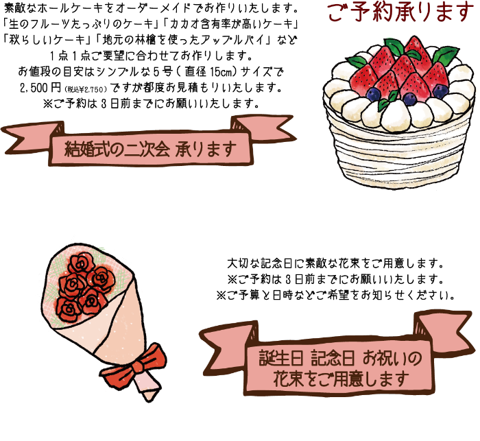 TOP 9 メニュー 9 オーダーメイドホールケーキ オーダーメイドホールケーキ ※食物アレルギーをお持ちのお客様はスタッフへお声掛けくださいませ。 ※お会計はお席にて承ります。スタッフへお声がけくださいませ。 ※メニュー内容、価格などは予告なく変更になる場合もございます。あらかじめご了承ください。 戻る 次へ