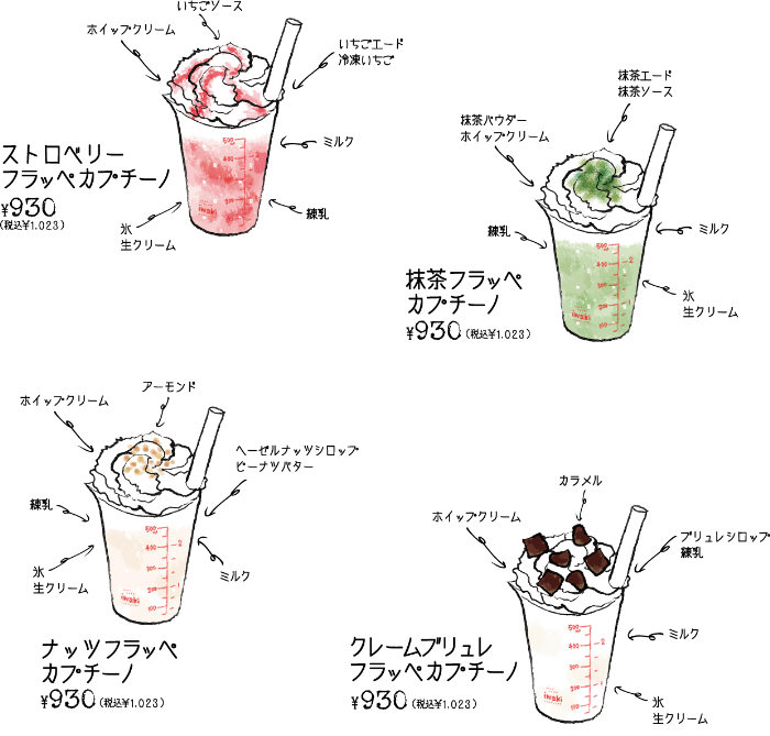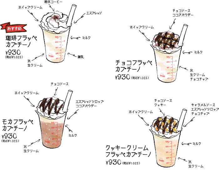 TOP 9 メニュー 9 フラッペカプチーノ フラッペカプチーノ ※食物アレルギーをお持ちのお客様はスタッフへお声掛けくださいませ。 ※お会計はお席にて承ります。スタッフへお声がけくださいませ。 ※メニュー内容、価格などは予告なく変更になる場合もございます。あらかじめご了承ください。 戻る 次へ